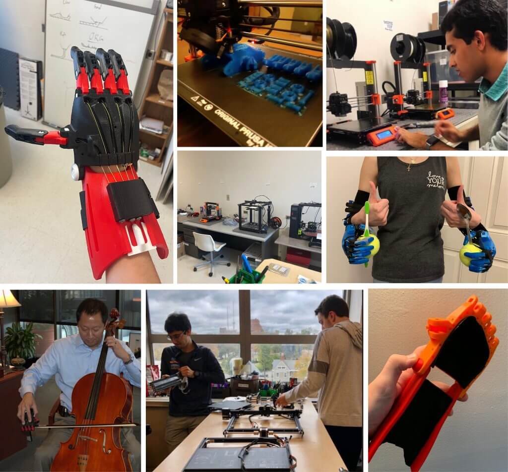 Clockwise from upper left: One of the hand models EnableUC is able to manufacture; Some of the hand components made using EnableUC’s 3D printers; An EnableUC member programs one of their printers; an EnableUC member demonstrates the functionality of one of the arm prosthetic created by the organization; An EnableUC member checks out the recently installed padding on a “Phoenix Hand”; Andrew Dilley, right, and another EnableUC member assemble 3D printers; Former UC Presidnet Santa Ono tries out an EnableUC occupational therapy device that allows an easier grip of a bow used on stringed instruments. Center: Some of the 3D printers in the EnableUC lab space.