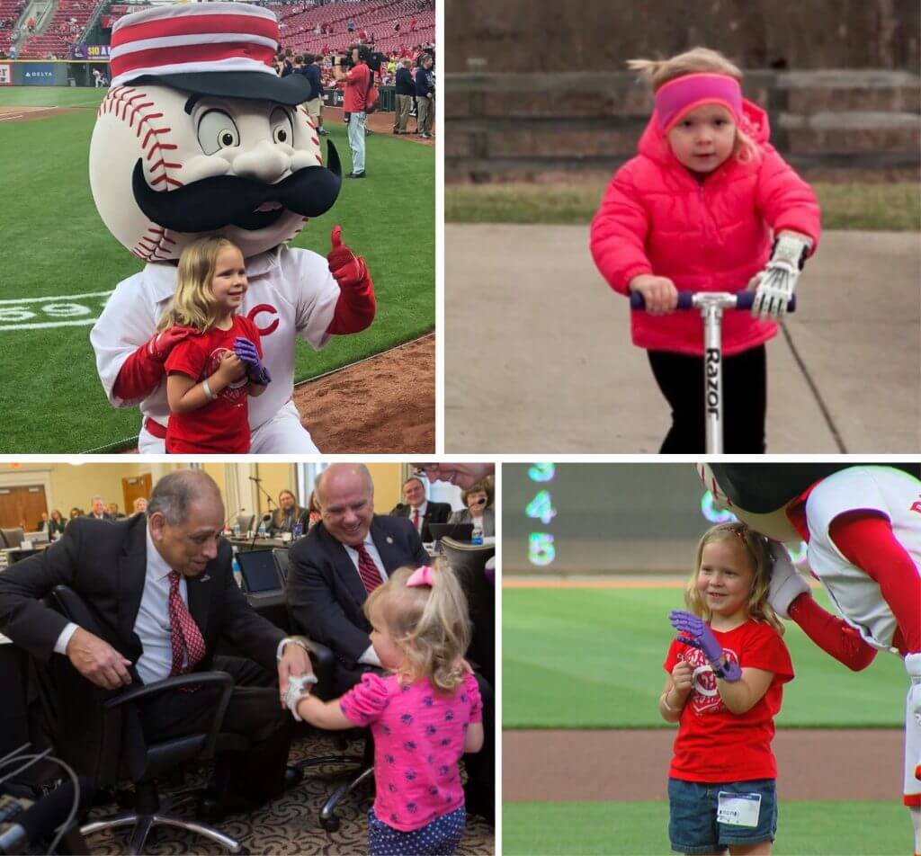 Clockwise from upper left: Ella with the Cincinnati Reds’ mascot at a game where she threw out the first pitch; Ella wearing her prosthetic hand from EnableUC while riding her scooter; Ella and the Reds’ Mascot; Ella shaking the hand of UC’s president Neville Pinto.