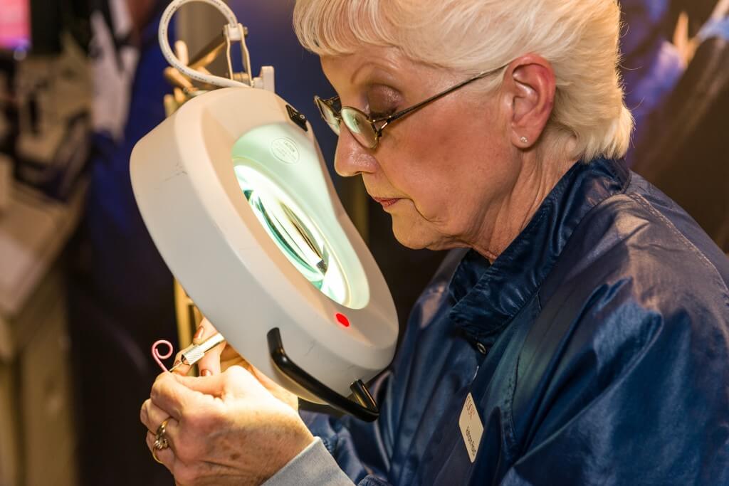 Physicians were surprised that punching sideports in catheters is done by hand. Here, Ruth Ann uses a magnifying lens to precisely position each sideport.