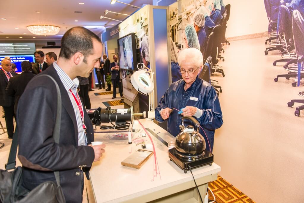 The Aortic Intervention and Peripheral Intervention SBUs invited invited two manufacturing employees to demonstrate their product handcrafting skills for physicians attending VEITH last month. Tina Phelps is shown here in the Cook pavilion.