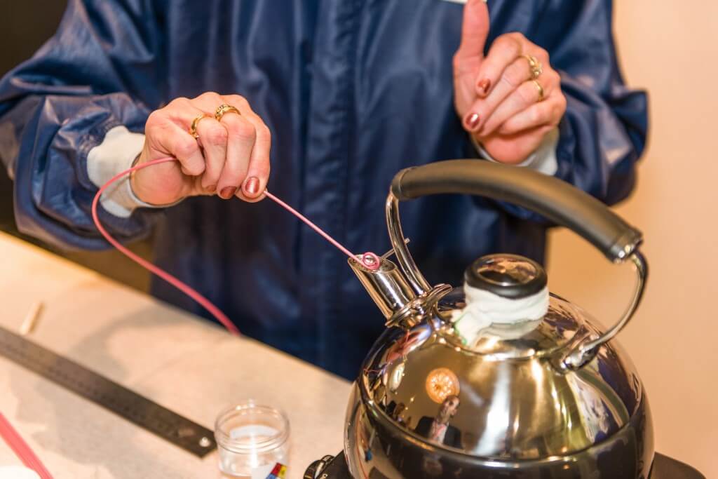 Ruth Ann Floyd demonstrates how catheters were formed when Bill Cook started the business — using steam from a tea kettle.