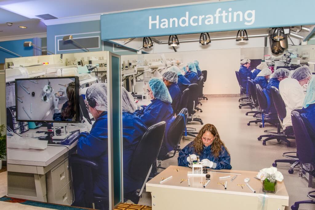 In the Cook pavilion, a handcrafting station was set up to look like the production area—including a manufacturing desk from Park 48—and cameras were installed above Ruth Ann and Tina’s hands so that VEITH attendees could watch their precise movements on large screens in the pavilion.