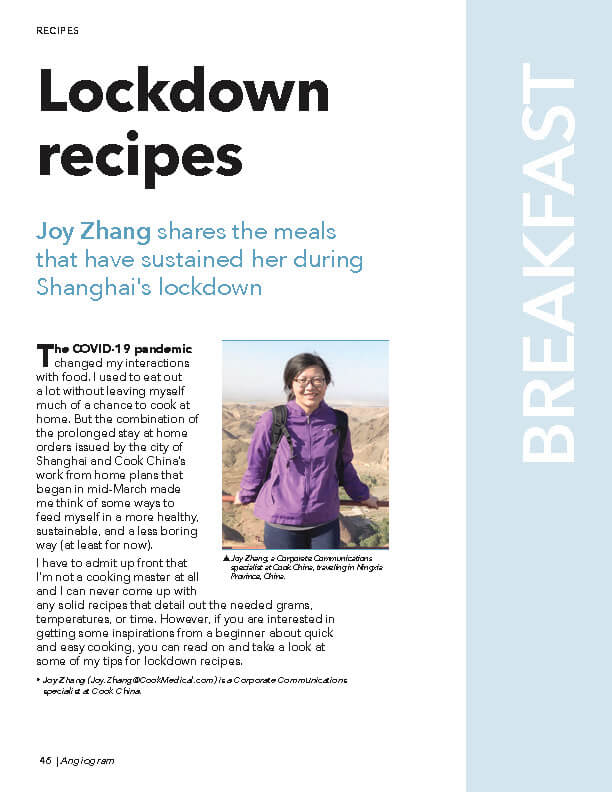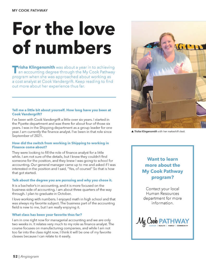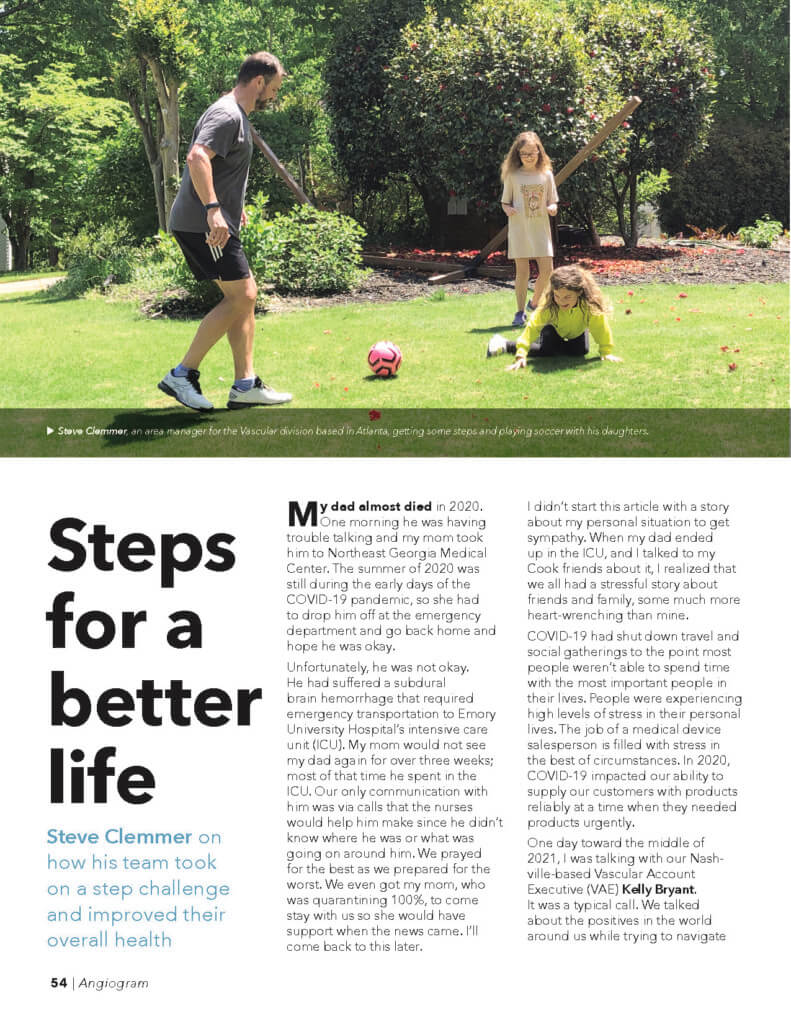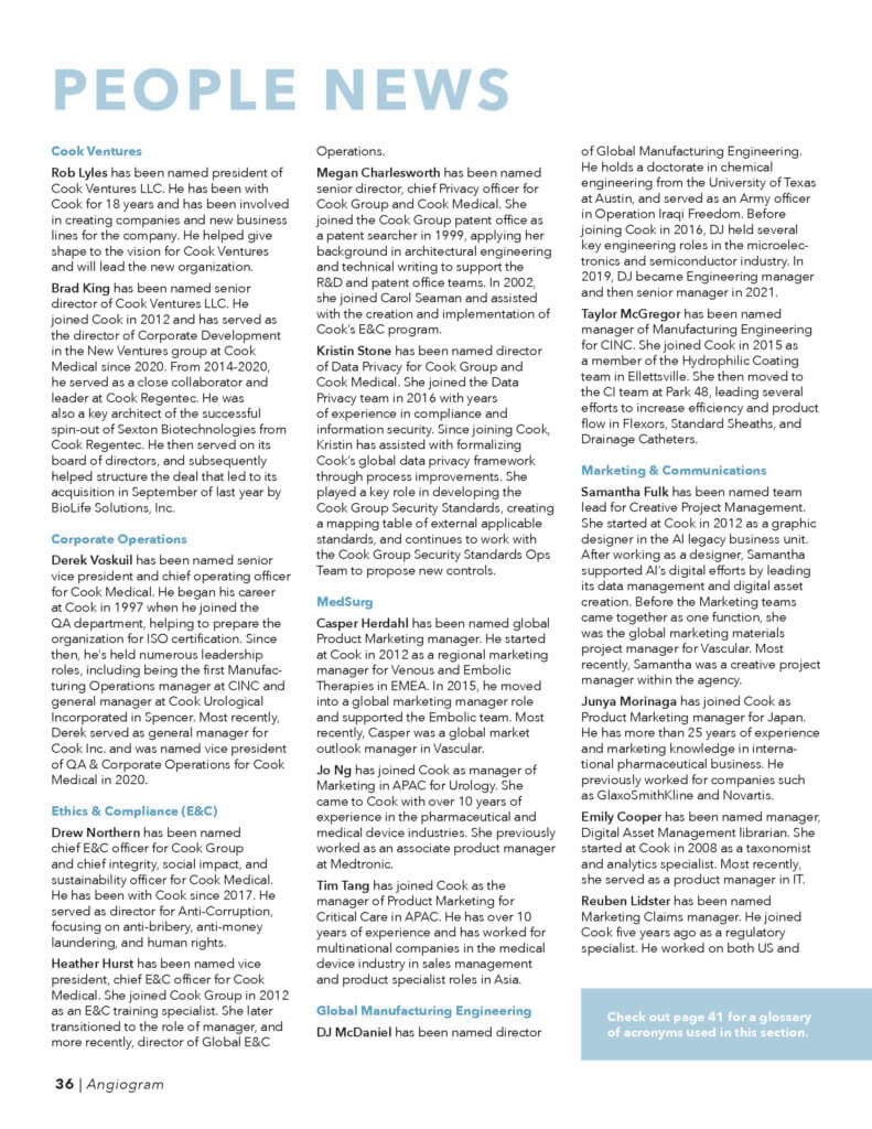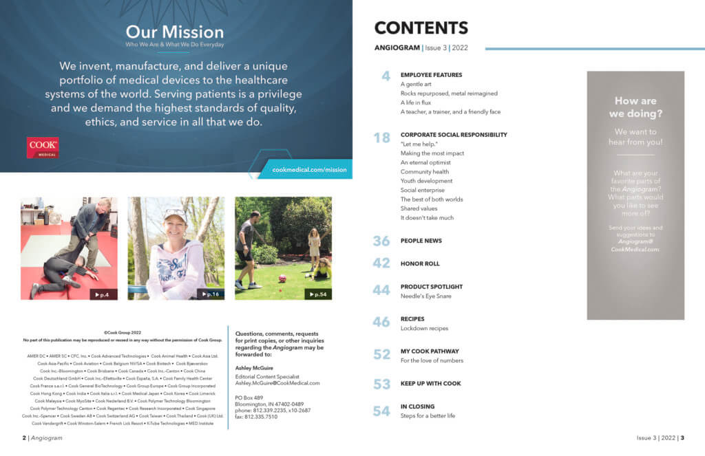 Because of the COVID-19 pandemic, some facilities have opted out of receiving print copies at this time. If your facility does not receive print copies, or if you are a field-based or remote worker, and you would like to receive a print copy, or to view the full digital version of the Angiogram, you can reach out via email at Angiogram@CookMedical.com.