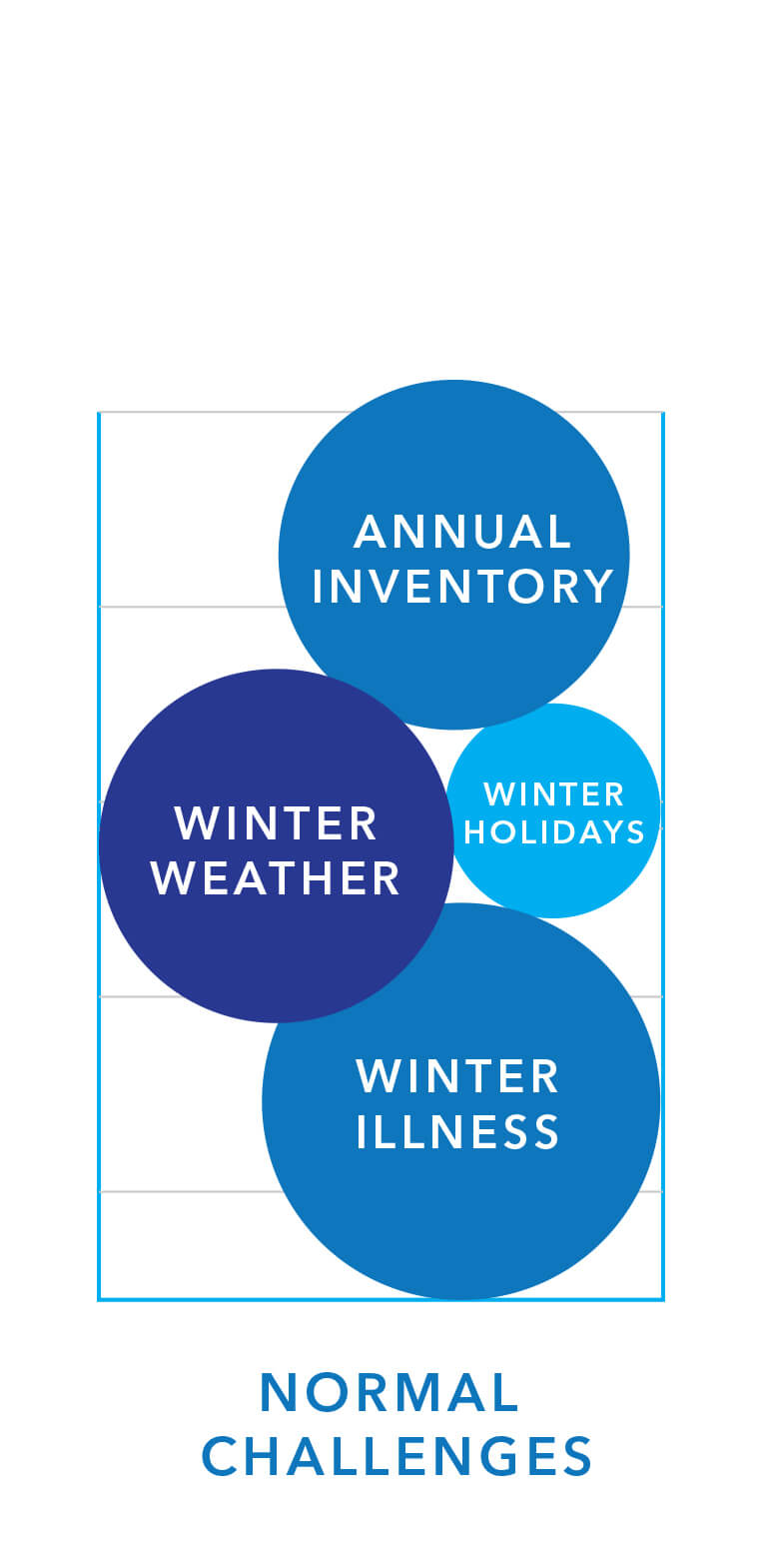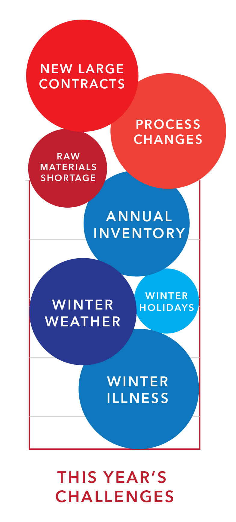 Right now, unfortunately, we are behind on shipment of products to our customers. This can and does happen around this time of year (but not usually to this extent). The holidays, winter weather, illness, and other factors impact our production output each winter. To try to get ahead, we ask for extra work from our production teams to build what we call “winter stock.” It makes sense to plan ahead.