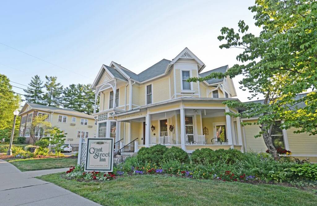 Then, in 2012, the Grant Street Inn constructed its first LEED-certified building, accounting for an additional 16 rooms, known as The Hoosier House. In contrast to the Victorian chic and old-world elegant rooms offered at the inn, these rooms offer a more modern and eco-friendly environment, complete with a Tesla charging station, bicycle storage units, a fitness center, solar panels, a water irrigation system, LED lighting, and much more. Even with its modern twists, though, the newest structure still mirrors the original house, replicating its similar trim style, fish scale cedar shingles, and two large front porches with rocking chairs, and of course, it radiates the iconic yellow exterior that the Grant Street Inn is known for. In total, the Grant Street Inn occupies an entire block near downtown Bloomington, consists of 5 different houses, and offers 40 different rooms that guests can book.
