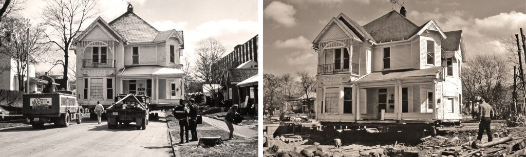 The Cook family agreed to save the Queen Anne style house, purchased it for $20, and moved it one and a half blocks east to its current location 310 N Grant St., Bloomington, Indiana.