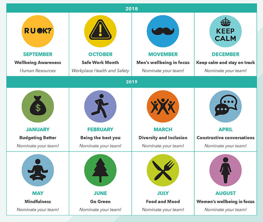 The “Well-being in Focus” calendar at Cook Australia aims to get more people involved in organizing our well-being activities throughout Cook. One way of doing that is for each department to choose a topic, and month, and organize an activity.