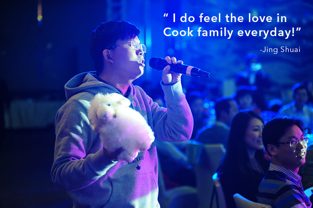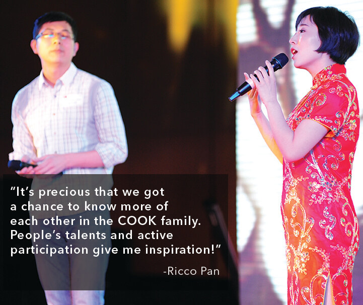 “Cook 2015 Annual Party is the most fabulous party I have attended. A golden chance to meet colleagues from different functions, delicious food for a good appetite, and excellent shows from teams. In the audience, I could definitely feel enthusiasm, love, and happiness within our Cook family!”