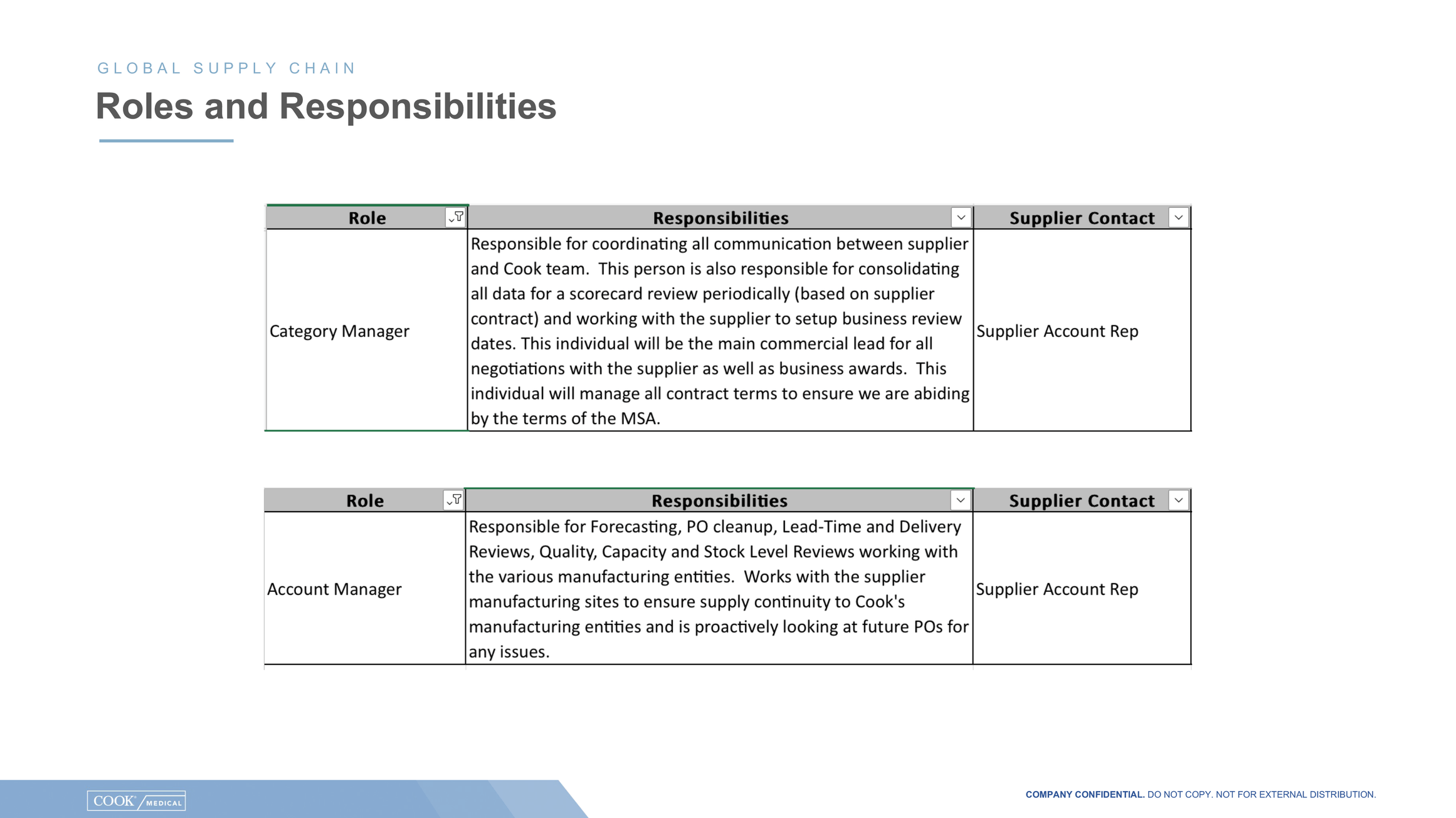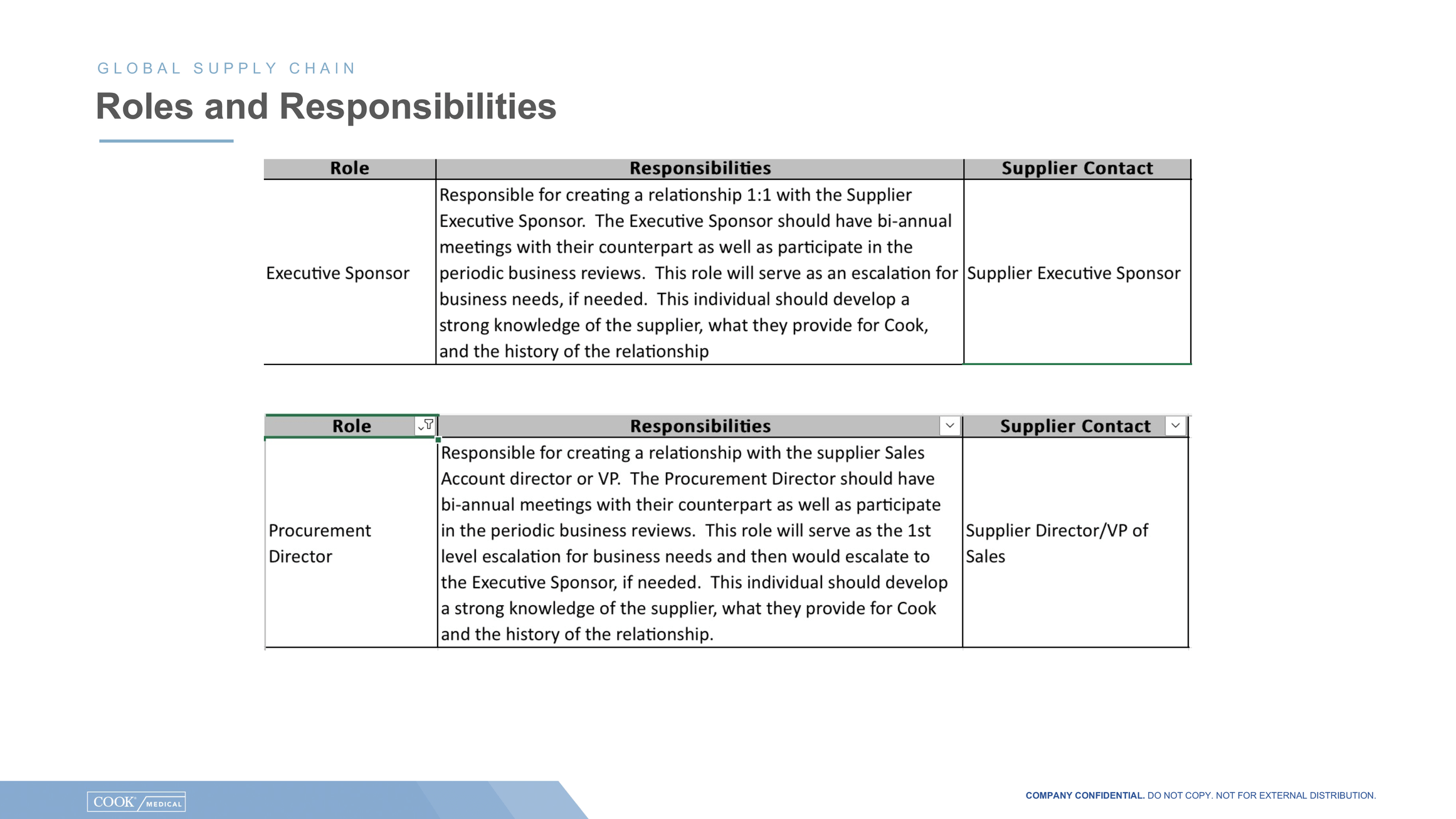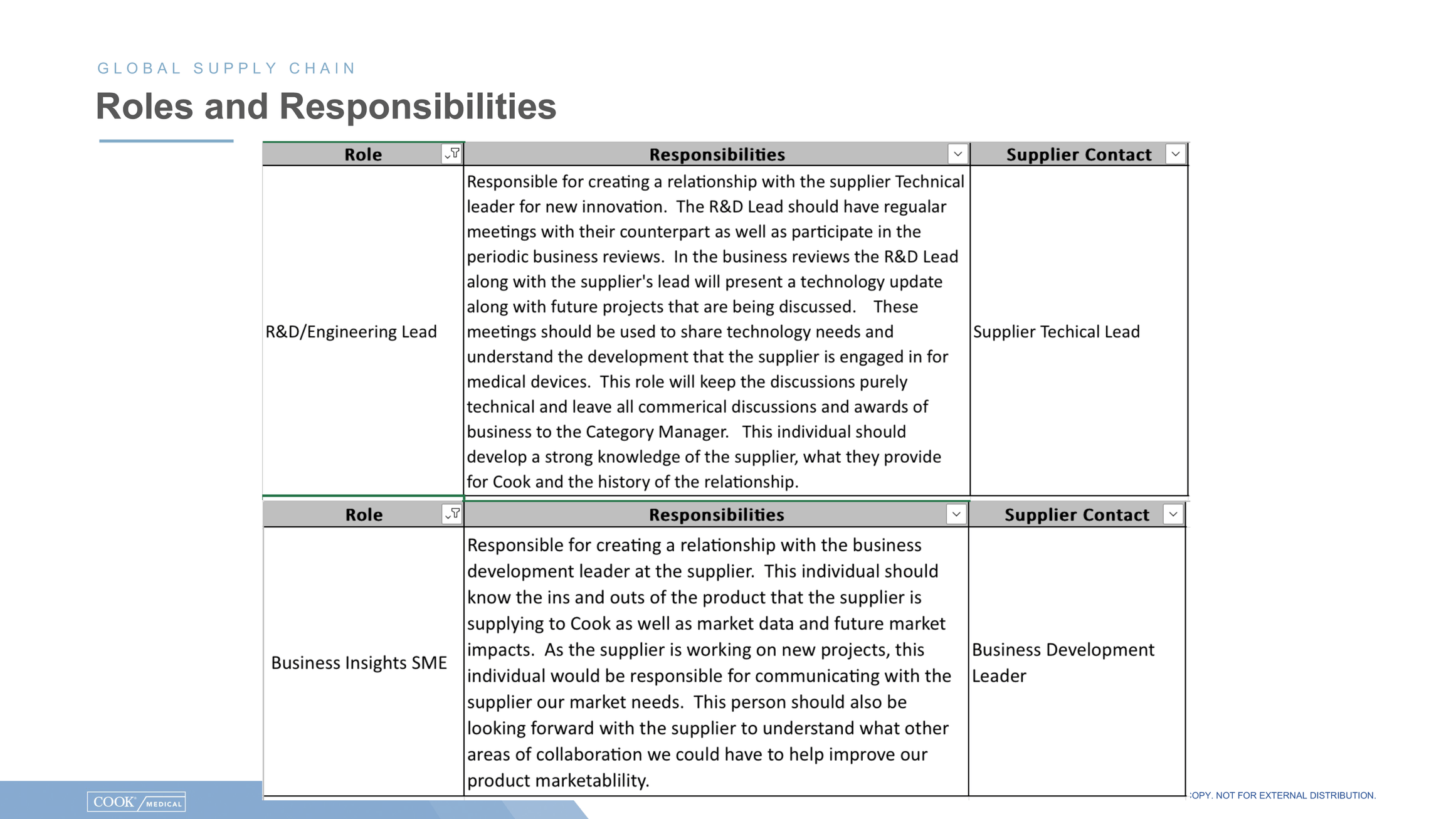 An additional connection point between both organizations will be a yearly “voice of the supplier” survey that will be run by Gartner. Up to 10 different people from a supplier’s organization will be asked to give feedback on Cook. Gartner will then provide Cook with a report out on the responses.