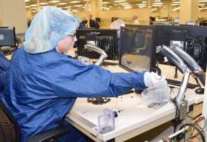 Nelia Hunsucker, assembler, prepares a catheter for final assembly. She refers to the EWO from her electronic work station.