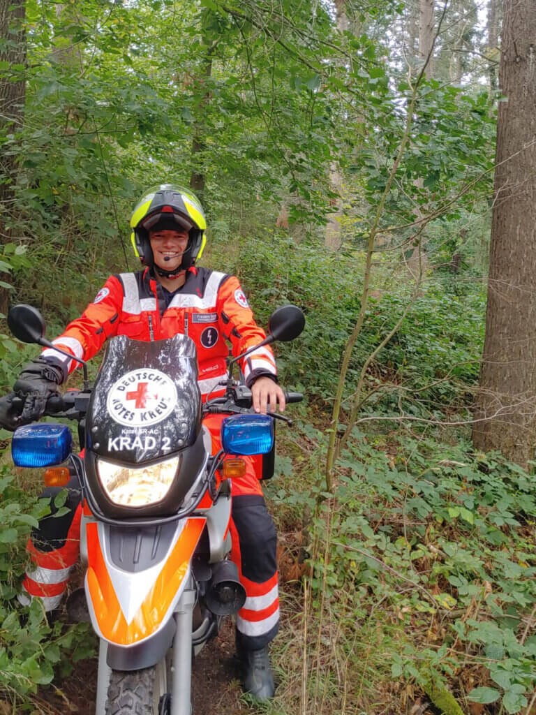 “Last year,” he recalled, “we had a missing person emergency in which the police asked the German Red Cross for help. Our organization has various types of transportation vehicles, from motocross bikes and land rovers to speed boats to reach where a normal car could not. I rode a motocross bike during this mission.”