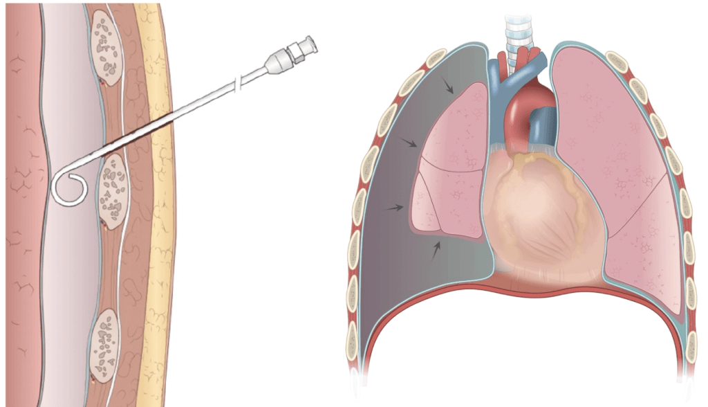 In the rendering on the left, you can see the catheter’s placement for draining a pneumothorax, which is represented in the illustration on the right.