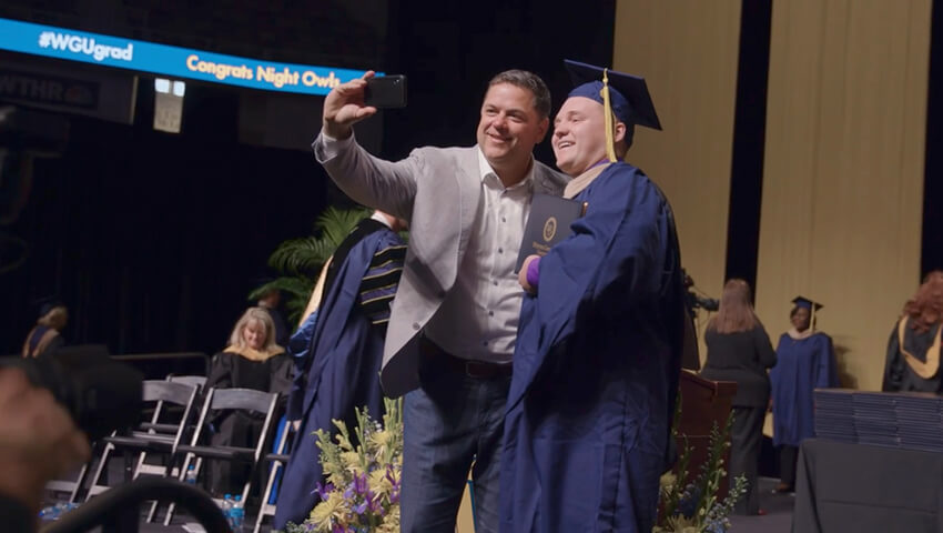 Pete Yonkman, president of Cook Group, takes a selfie with Austin Feather at Austin’s WGU graduation.