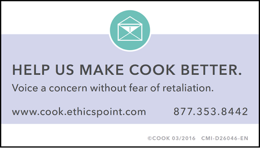 Our Ethics & Compliance (E&C) team has always encouraged this kind of thinking. They have offered a Helpline phone number and also contact information for the E&C department so employees could call to report situations or actions that were against our company values and Code of Conduct. Cook has always held itself to a high standard of honest and ethical behavior. Not only did our founder, Bill Cook, personally feel that ethics are important, but he knew that in healthcare in particular, the work we do impacts so many people outside of our walls – patients, healthcare practitioners and facilities, public and private agencies, and communities as a whole. We have a responsibility to all of those people, as well as to each other here at Cook, to set high standards and live up to them. And increasingly, governments around the world are stepping in and setting ethics guidelines for companies in our industry.