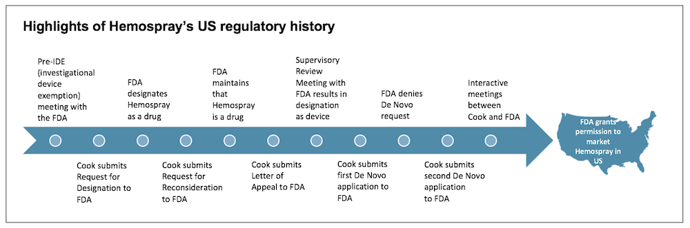 After submission of the RFD, the team was hit with a surprise. The FDA came back with a completely different determination: they designated Hemospray a drug instead of a medical device. This drug designation led to three years of negotiation with the FDA, filled with appeals, written statements, review meetings, and bringing in outside expertise to prove the product was indeed a medical device.