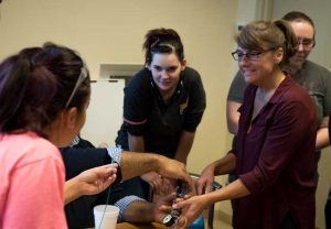 Angie Davis (far left), Becca Hartline (center), and LeAnn Feeman (right) examine some devices made at other locations.
