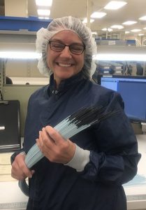 LeAnn Feeman proudly holds a bundle of the first 5 Fr Torcon Beacon Tip catheters to be completed once production began again in Canton.