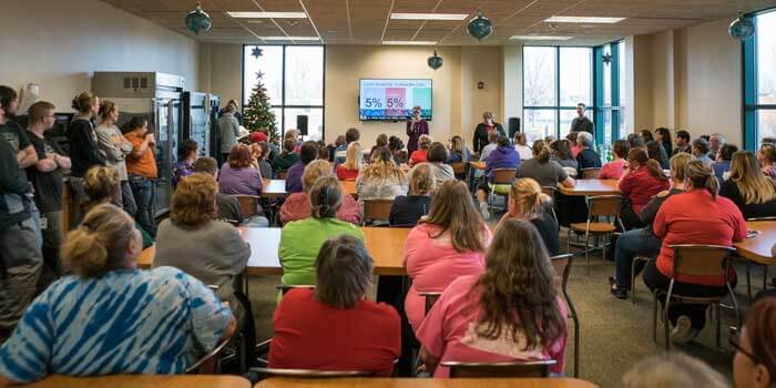 Staff gathered in the Canton lunch room to listen to the visitors from Park 48 talking about the return of the Beacon Tip.