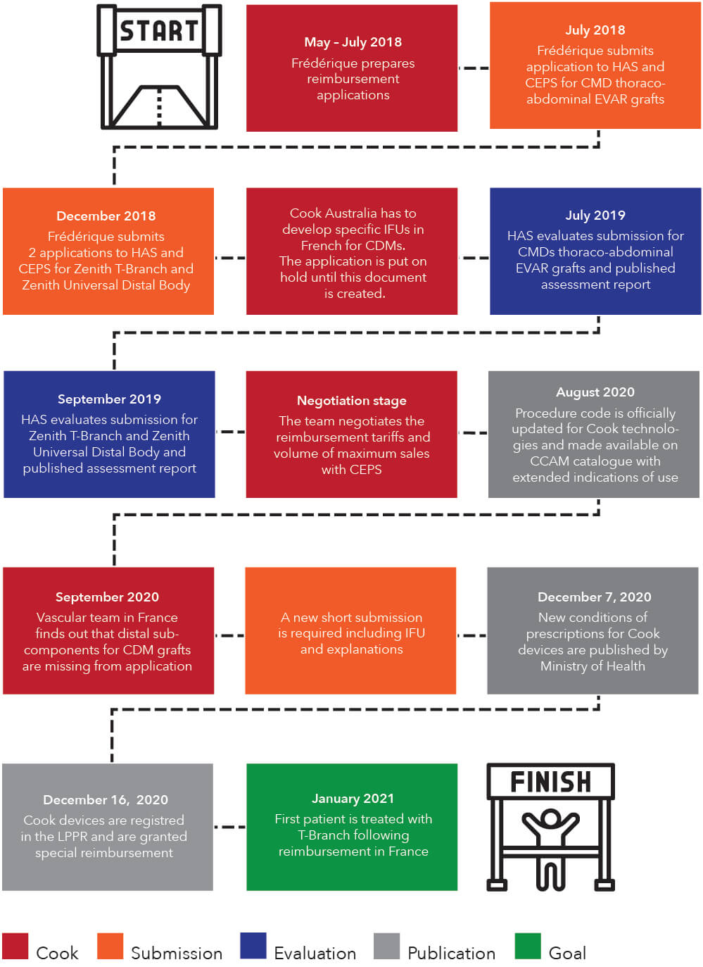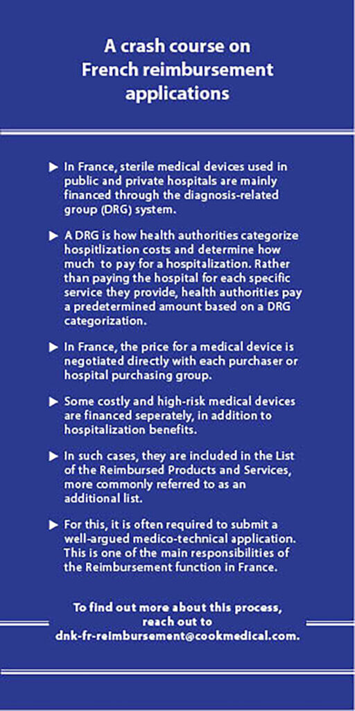 French reimbursement applications can entail a mixture of tight deadlines and solid teamwork among different departments. They must also include a long list of technical, clinical, and economic information on Cook devices. The evaluation process usually takes six months, if nothing is missing.