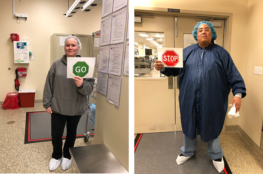 Jozie Deckard, left, and Josh Winters, right, from Dept. 37, Special Sets Radiology QC, demonstrate the “stop” and “go” signs.