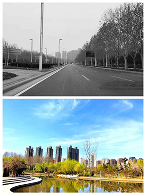 Pictures from Zhendong: The empty street in Zhengzhou and the beautiful springtime park in Zhengzhou.