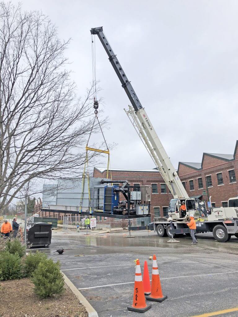 The temporary cooling tower being unloaded at the Showers Building in Bloomington.