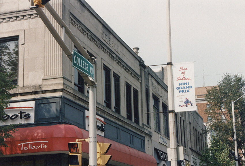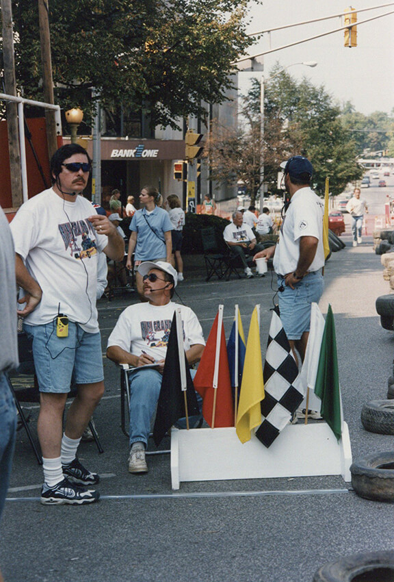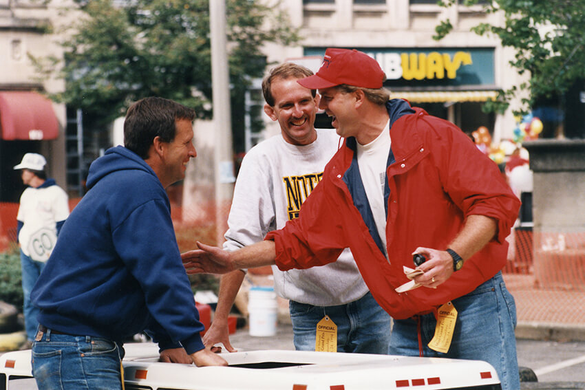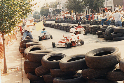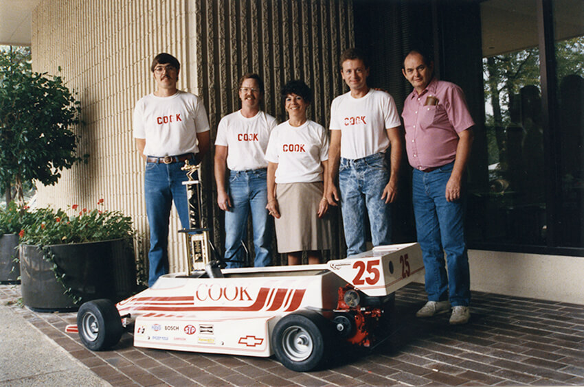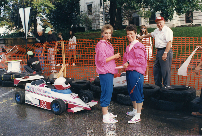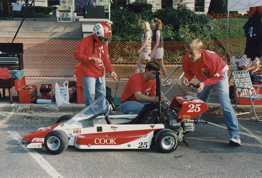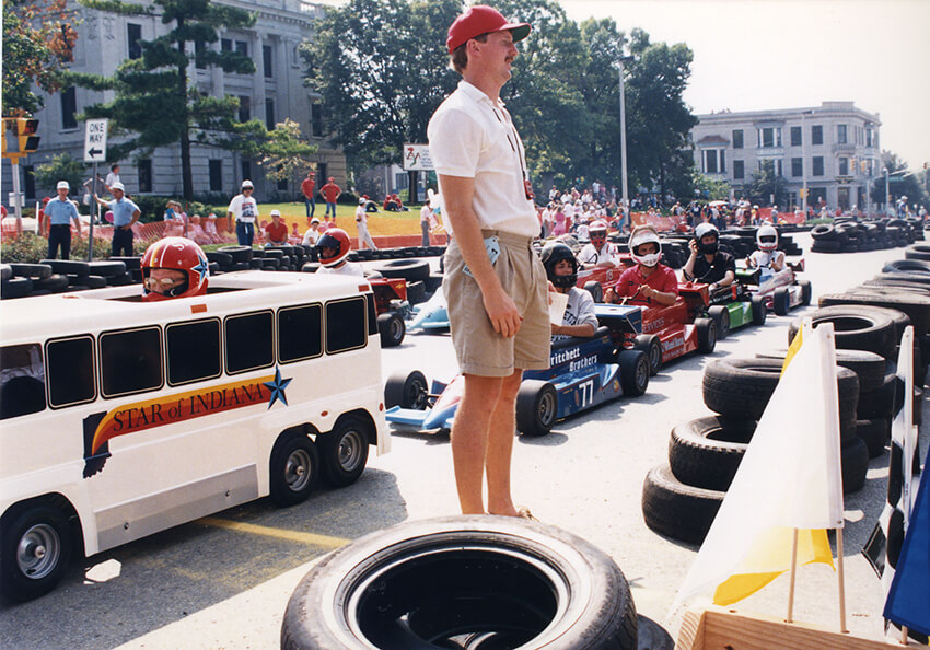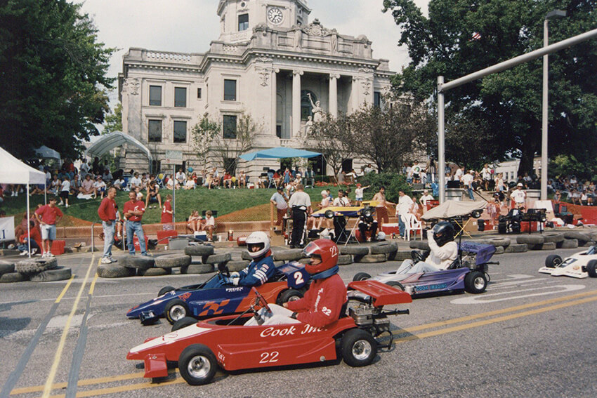 September 10 marked 30 years since the first Star of Indiana Mini Grand Prix. For those who were not around to experience the event first-hand, it was a mini-car race sponsored by Cook with Bill Finch (one of Cook’s attorneys) as an organizer. It took place around the courthouse square in downtown Bloomington as part of an annual fall celebration called Hoosier Fest. The square was blocked off, and the course was marked with stacks of tires. Over the years, local businesses and many Cook companies at the time, including Cook Inc., Cook Imaging, Cook Aviation, CFC, Cook Group, Cook Urological, Sabin, and Cook Pacemaker Corporation, had cars in the race.