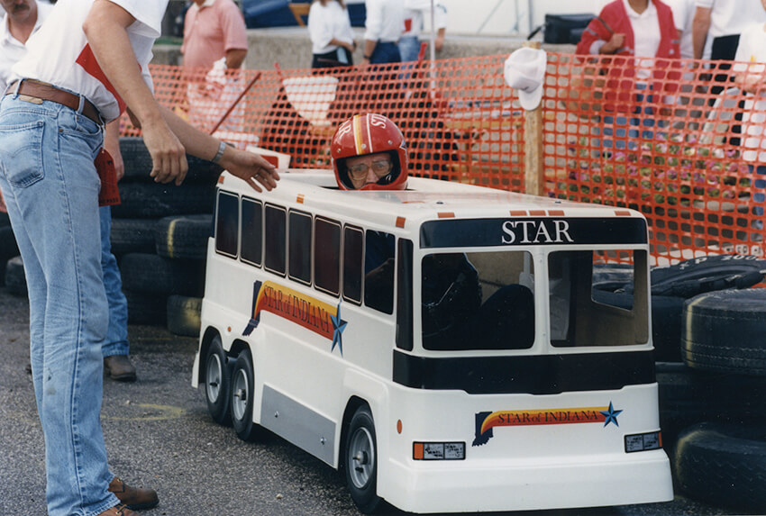 The event took place annually from 1988 to 2000 and served as a fundraiser for the Star of Indiana Drum and Bugle Corps. Bill Cook drove a pace car that looked like a Star of Indiana bus. Many Cook employees helped to make the race possible by setting up the track before the sun came up and tearing down the event, working as track stewards, track marshals, and starters, managing transponders, arranging insurance, driving cars, working in the pit crews, etc. Rex Hinkle, president of Cook Aviation, sang “Back Home Again in Indiana” every year.