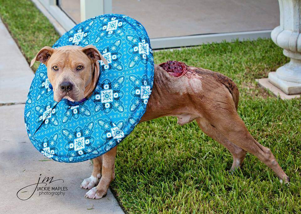A compassionate soul in a town just north of Houston, Texas, found a stray dog with a gruesome wound on his back. Even though a vet recommended euthanizing the dog, the rescuer took the dog to the local animal shelter.