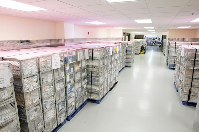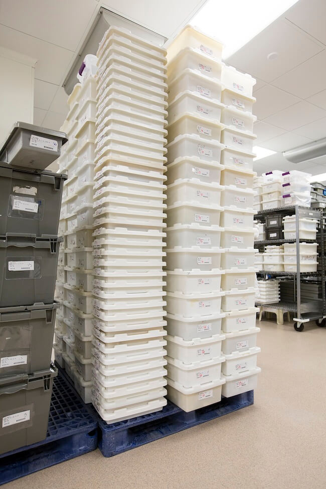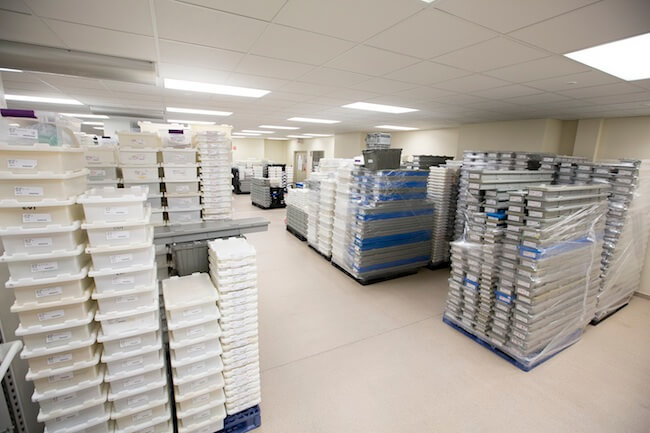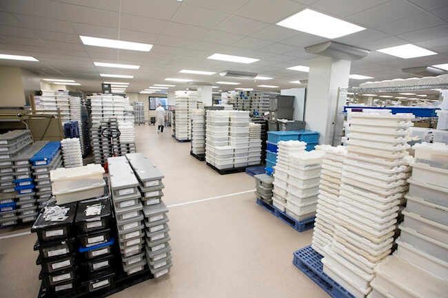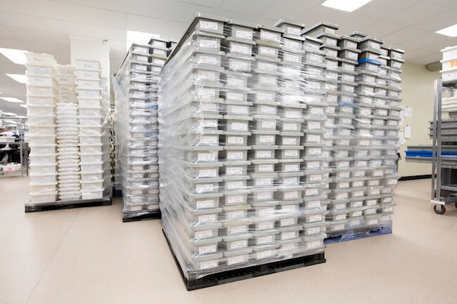 The Big Push ended in late May, but the extra products resulting from that work in manufacturing have been working their way through the system. A large wave of products has been keeping the Packaging Department hopping for the past couple weeks. Extra processing lines have been set up to handle the extra volume of product, and other departments loaned workers to pitch in.  We thought we’d show you what that volume of product looks like, creating a towering maze of bins and trays. Take a look at the slideshow.