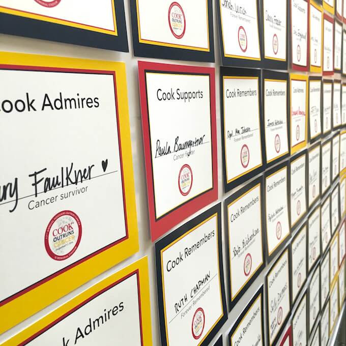 Employees honored loved ones who have been touched by cancer. These cards will be displayed at the Cook table at the 17th annual Hoosiers Outrun Cancer event.