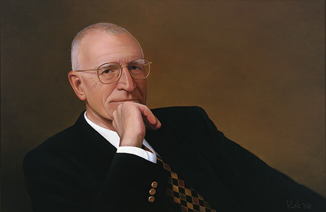 The covers of The Bill Cook Story, Vols. 1 & 2, both feature portraits of Bill painted by Keith. One of these (shown below) was modeled after a well-known portrait of John F. Kennedy by American artist Jamie Wyeth. This was a commissioned work for Bill, outside of Keith’s day job. When Bill saw the finished portrait, he told Keith he was not charging enough for his work. Keith recalls that Bill joked as he handed Keith a check to pay for the painting, saying, “You might want to wait to cash this.”