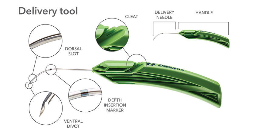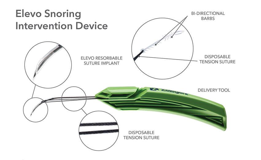 The delivery system for Elevo allows placement of specially shaped sutures that provide lift to the soft palate during the Elevoplasty procedure. The sutures are then naturally dissolved by the body. Elevoplasty can be performed under local anesthesia in an office setting without the need for surgery. Elevo is indicated for symptomatic, habitual, and social snoring due to palatal flutter.
