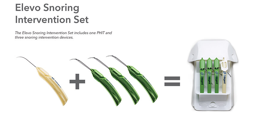 Indications for Use: The Elevo Kit Snoring Intervention Device is intended for use in stiffening the soft palate tissue, which may reduce the severity of snoring in some individuals.
