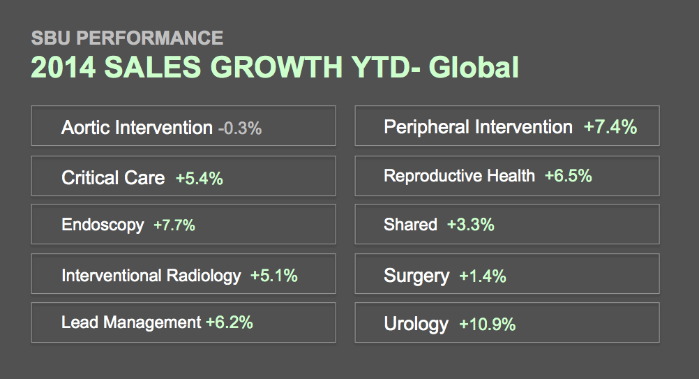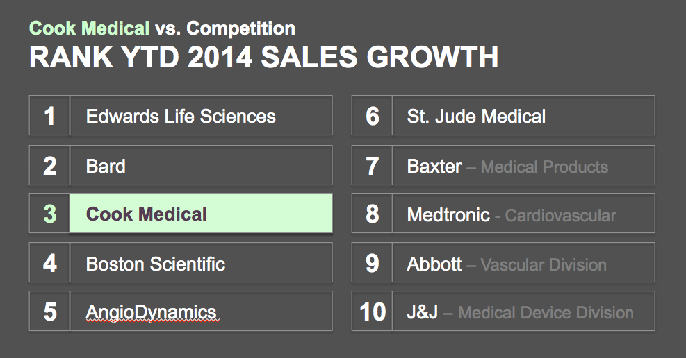 • Get better at conversions — Sometimes a hospital would like to switch to not just one Cook product but all of the Cook products for a department (urology, for example). This is not an easy task. Lots of physicians and nurses need to be trained. It gets even harder when 10 hospitals choose to convert at the same time. We have gotten much better at this over the years, and we will get even better in 2015.