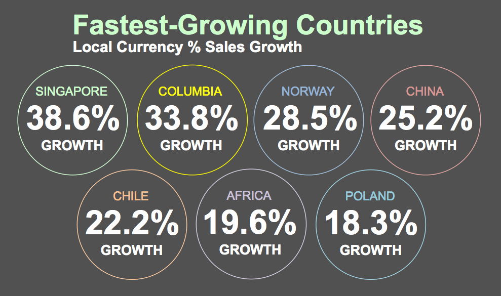 Some country markets are expanding rapidly, showing impressive sales growth over last year.