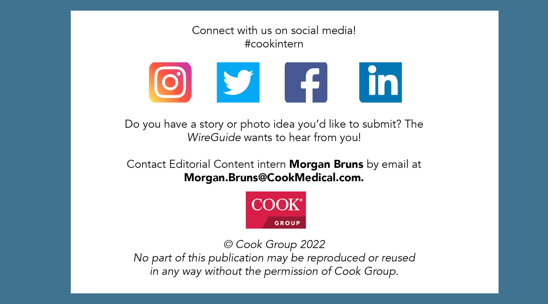 With that being said, welcome to the WireGuide! I appreciate every one of you that helped in making this possible. If you have any content ideas such as feature stories, gallery photo topics, or something else, please let me know. You can reach me at Morgan.Bruns@CookMedical.com. Enjoy!