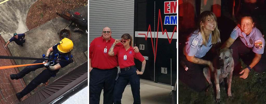 On the left, Miranda descends a building during her time as a paramedic firefighter. In the center, Miranda poses outside of an ambulance with her coworker during her time as a paramedic. On the right, Jack, the dog, got a second chance at life after Miranda and her coworker saved him from a house fire.