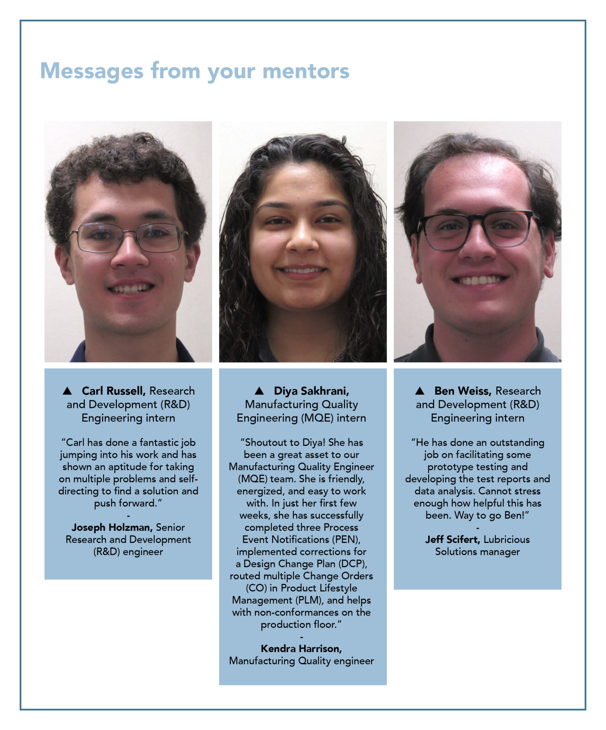 1. Looking for another resource on our intranet, I just found the relaunched WireGuide. I love this! Morgan, thanks for your work in bringing this back and making it available on our intranet. Pre-pandemic it was easy to run into and meet our many interns while in P48. Now in our hybrid virtual setting, this is more challenging. The WireGuide is a great way to meet and greet all these great interns. With a quick read-through, I learned about the varied backgrounds, experiences, and accomplishments of these interns. Good luck to all of you!