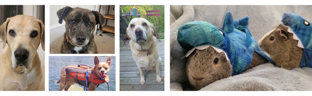 Miranda’s rescue dogs, from left to right: Sandy, Shelby (top), Drake (bottom), and Delilah Sunshine. Miranda’s guinea pigs, Luc and Henry, sporting the latest guinea pig fashion trends.
