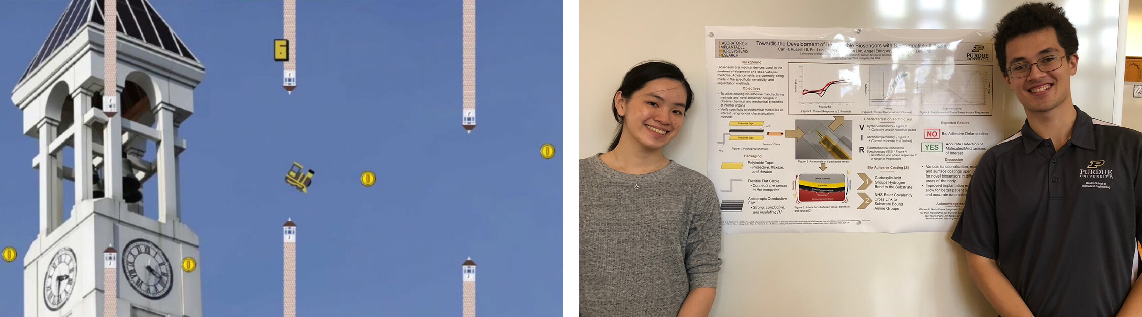 Through EPICS, Carl has worked on many biomedical engineering projects. His team developed a Flappy Boiler game for the Imagination Station Children’s Museum in Lafayette, Indiana, that is similar to the once iconic Flappy Bird game that dominated children’s smart device screens in 2013. However, there are a couple of differences. They understandably switched the icon in this game from a bird to a train to represent their school mascot. Also, rather than tapping on the screen to move the icon, this game uses electromyography (EMG) signals from the user’s arm. EMG measures the electrical currents generated in the muscle while contracting.3 Therefore, when the user squeezes or twists their arm, the EMG signals move the train in the game.