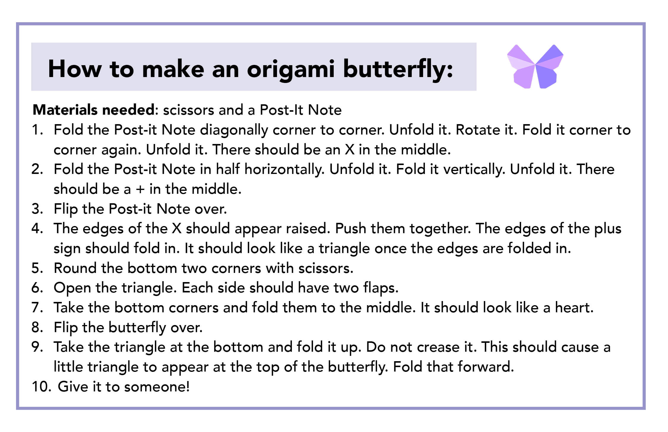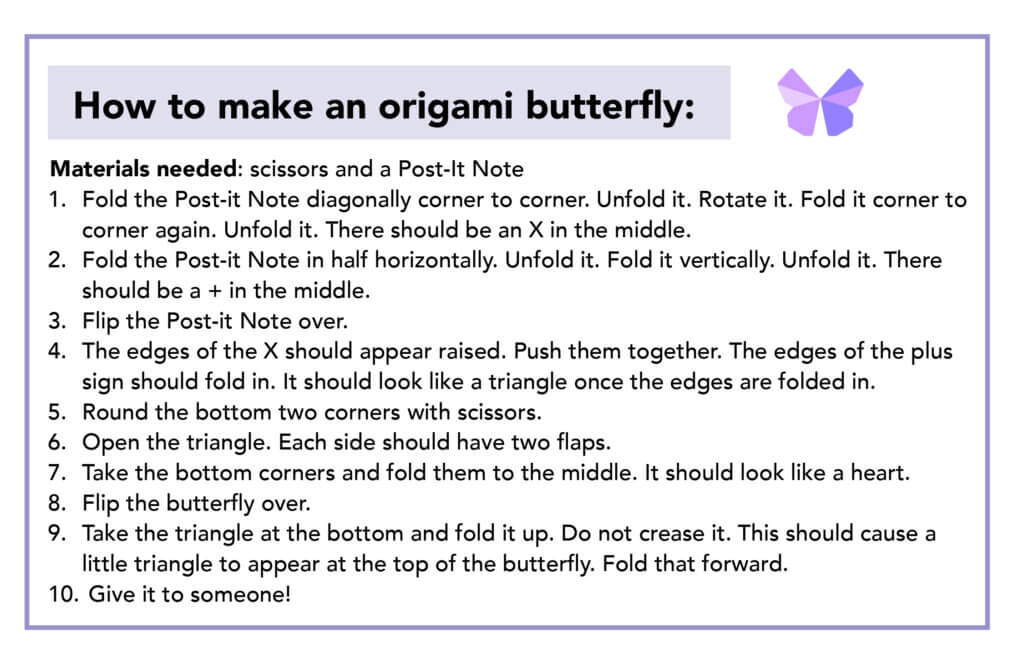 Whether it be a to do list that seems never ending, back-to-back meetings, or upcoming deadlines, we’ve all had stressful days. Sometimes we take a break, go for a walk, or confide in a friend to make our day better. For those that sit by Kylie Littlejohn, it’s something as little as an origami butterfly that puts a smile back on their face.