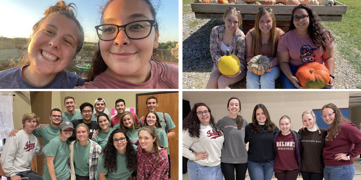 Clockwise from upper left, Kylie and intern Olivia Loesch at the Monroe County Fair; Kylie and fellow interns Cassie Heininger and Rachel Kaufman picking pumpkins last fall; Kylie with “Cru,” a ministry she attends while interning; Kylie with “Delight,” a ministry that Kylie is involved in at the University of Louisville