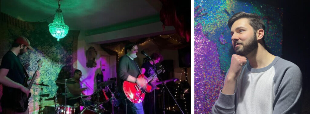 On the left, Micah and his bandmates in the Loxmiths playing at Saint Cat’s Sound House. On the right, Micah posing at Louisville Zoo.