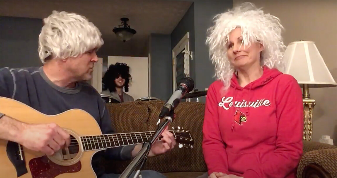 Left to right: Mark Wright, Micah, and Jill Wright performing a Youtube skit during the coronavirus pandemic lockdown.