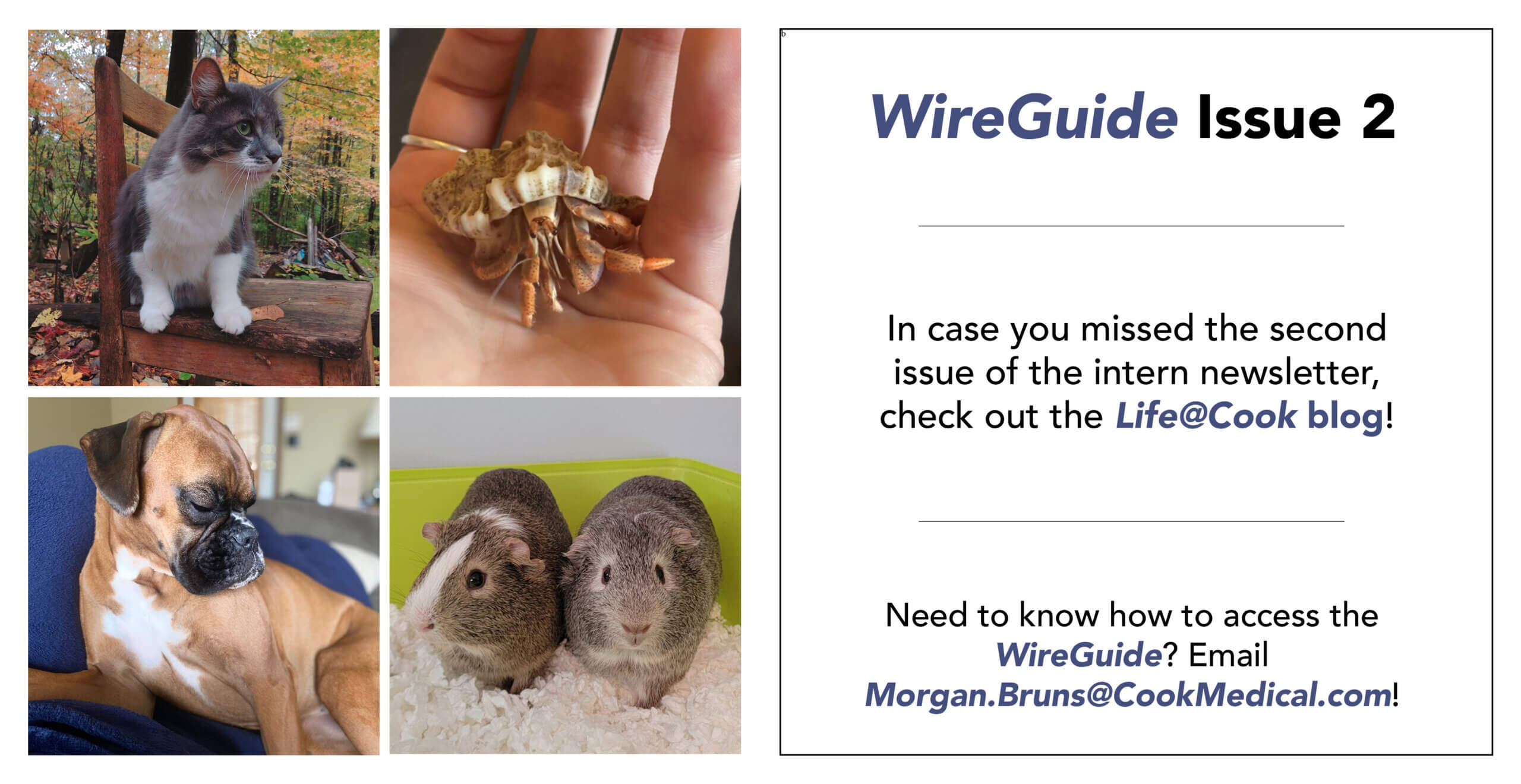 The WireGuide is a digital newsletter that was created in 2017 by a group of marketing interns. With intentions of connecting interns throughout Cook with each other, they created content surrounding the other interns’ lives. The WireGuide stopped in the summer of 2020, as there wasn’t an intern program due to the pandemic. Two years later, we are relaunching it on a new platform. Now featured on the Life@Cook blog, the WireGuide and its stories are available to an even bigger audience. With that being said, welcome to the WireGuide!