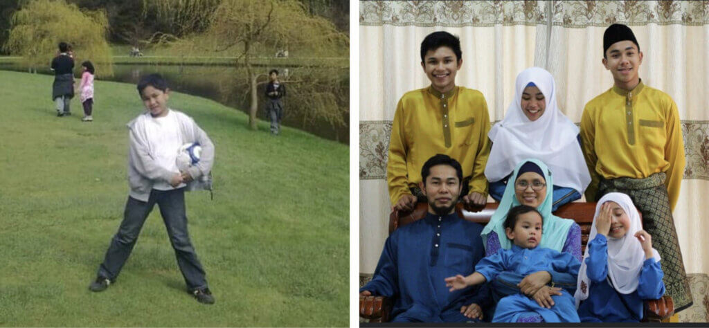 On the left, Ihsan playing soccer in Hyde Park in London, UK. On the right, Ihsan with his family in Malaysia celebrating Eid, a holiday that celebrates the end of fasting for Ramadan.