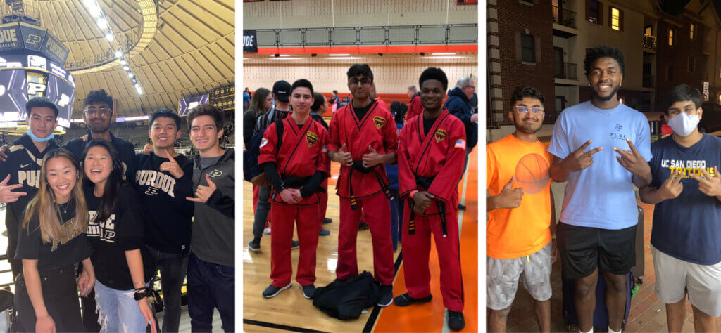 On the left, Nikhil and his friends enjoying a Purdue basketball game. In the middle, Nikhil and his friends at their National Karate Black Belt Exam. On the right, Nikhil and his roommates had the opportunity to meet Trevion Williams, a Purdue basketball player.