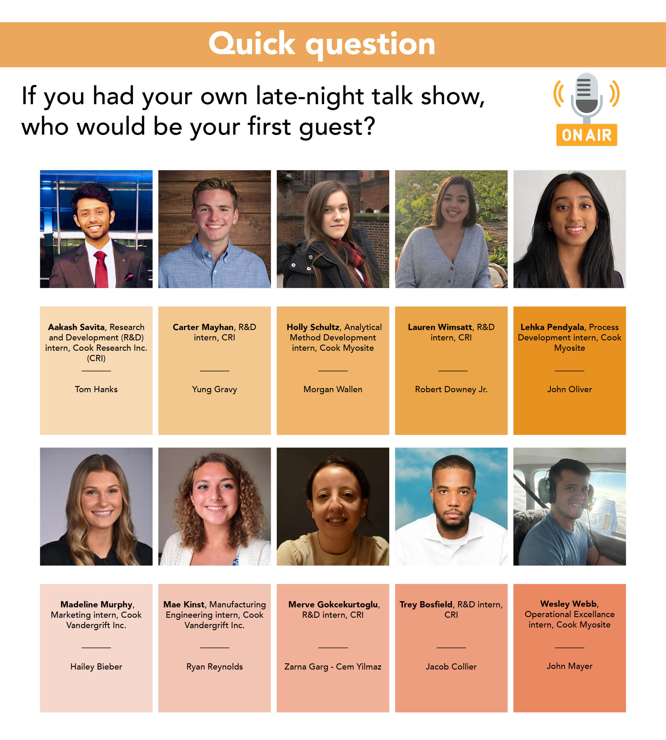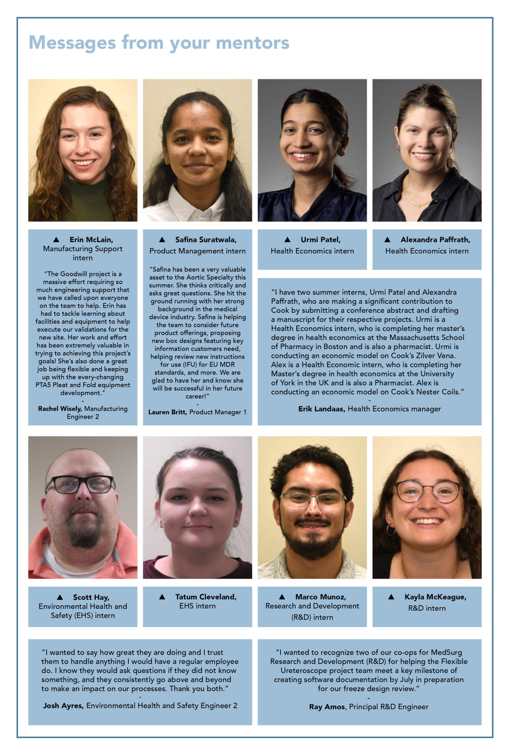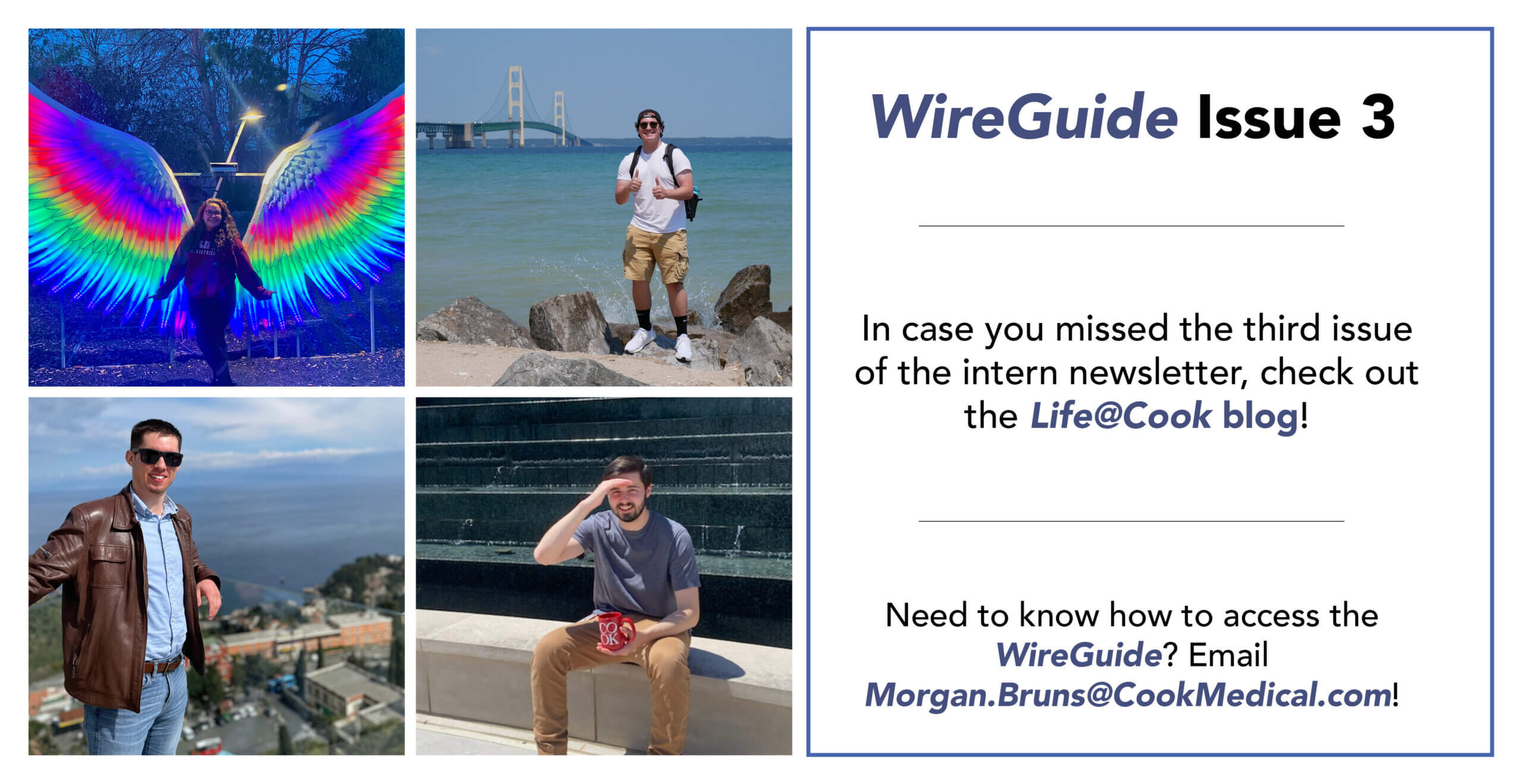 The WireGuide is a digital newsletter that was created in 2017 by a group of marketing interns. With intentions of connecting interns throughout Cook with each other, they created content surrounding the other interns’ lives. The WireGuide stopped in the summer of 2020, as there wasn’t an intern program due to the pandemic. Two years later, we are relaunching it on a new platform. Now featured on the Life@Cook blog, the WireGuide and its stories are available to an even bigger audience. With that being said, welcome to the WireGuide!