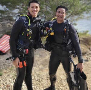 Ihsan, right, and a classmate on their open water certification day for scuba diving.